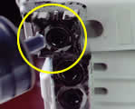 11、如果打印机安装了连续供墨系统,有时候清洗打印头也不能解决打印断线的问题,这个问题基本出现在墨盒上,是墨盒中的气泡造成了打印断线问题,解决办法是使用医用注射器直接连接墨盒下方的出墨口,用力插入出墨口进行抽取,墨水和气泡会被一同抽取出来,抽取出来的墨水可以重新注入墨水瓶使用: