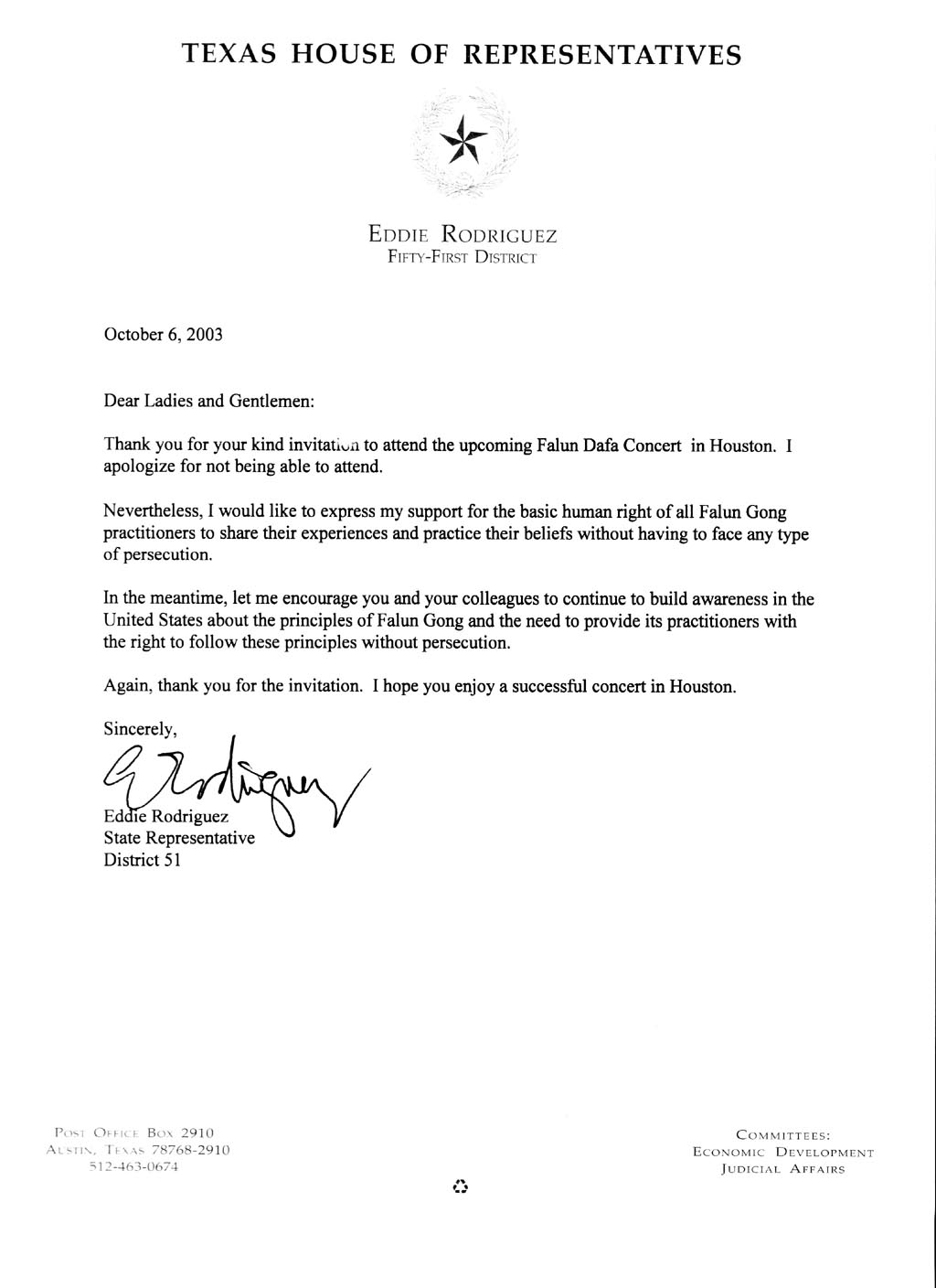 非常感谢各位邀请我出席在休斯顿举办的法轮大法音乐会,非常抱歉我不能亲自前往。