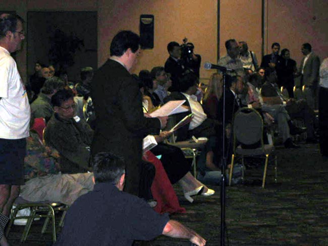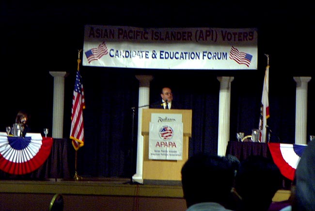 第一位候选人哈芬顿发言后,一位西人弟子问她,如果当选州长她会做什么来停止这场对法轮功的迫害,因为这场迫害不仅危害千百万中国人民,还影响很多加州居民,因为他们有亲属在中国被关押折磨,而且有证据显示旧金山中领馆在干扰美国政府官员支持法轮功。候选人哈芬顿回答说她会表达出她的意见---迫害法轮功是错误的,她会站起来维护法轮功学员的权利。