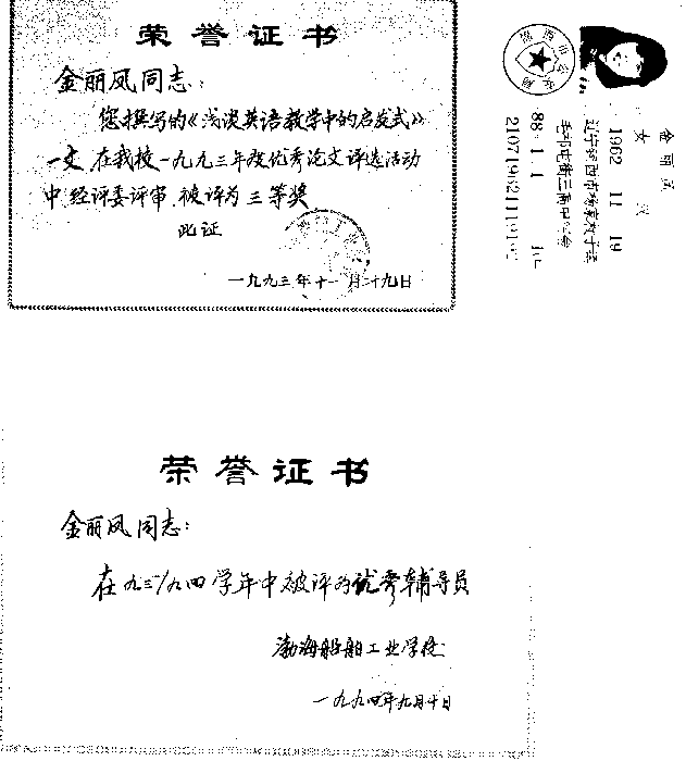 附:金丽凤的《荣誉证书》、《非法拘捕通知书》、《离婚证》及本人的《身份证》。
