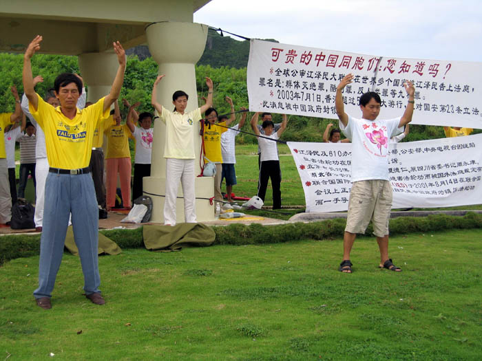 第二天早上,我们在一个著名的旅游点炼功洪法,当地同修在附近挂满了横幅,摆放许多真象展板,因为那里有来自中国的游客,果然在我们炼功时,有许多中国游客主动走来了解真象,他们做梦也想不到:小小的岛屿也有这么多人炼法轮功!