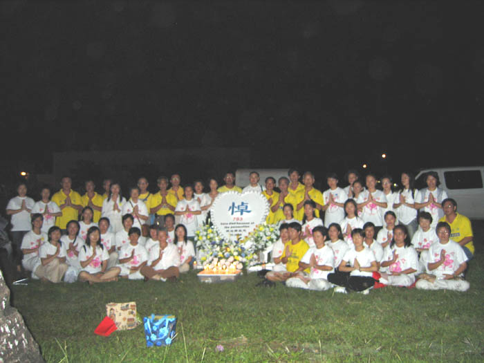 接著晚上举行烛光守夜悼念被迫害死亡的大法弟子,呼吁拯救被无理关押的美国公民李祥春,并呼吁善良的人将江氏送上审判台。后来我们发现晚上活动时照出来的相片,显示出大大小小的法轮,有的里面的卍字符清晰可见。
