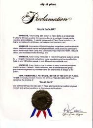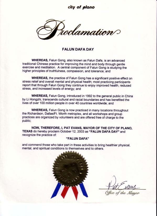 有鉴于此,我,帕特-埃文斯(PAT EVANS),德克萨斯州布兰诺(PLANO)市市长,特此宣布2003年10月12日为“法轮大法日”并认可修炼“法轮大法”,表彰那些参与给他们自己和他人带来更健康的身心活动的人们。