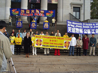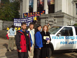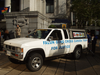 温哥华法轮功发言人索非亚-布劳文(Sophia Bronwen) 宣读了横跨加拿大汽车之旅的声明,声明说,江泽民镇压法轮功四年多来,致使800多名法轮功学员迫害死亡,几十万人关在监狱、劳教所遭受酷刑,千千万万个家庭妻离子散、家破人亡。而现在罪恶仍在继续。汽车之旅将横跨加拿大,感谢加拿大人民营救受迫害的法轮功学员所作出的卓有成效的努力,同时呼吁明白真相的加拿大人民和我们站在一起,共同把迫害人类善良本性的邪恶元凶江泽民送上历史的审判台。