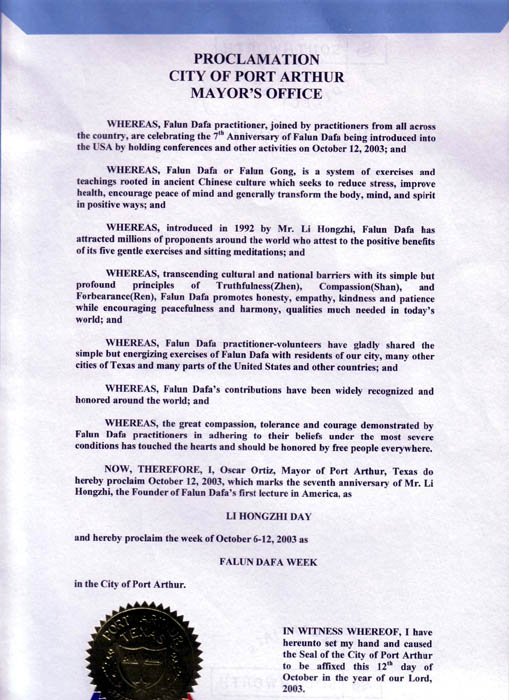 有鉴于此,我,奥斯卡-奥蒂兹 (OSCAR ORTIZ),德克萨斯州阿瑟港(PORT ARTHUR)市市长,值此法轮大法创始人李洪志先生在美国首次讲法七周年之际,特此宣布2003年10月12日,为阿瑟港市