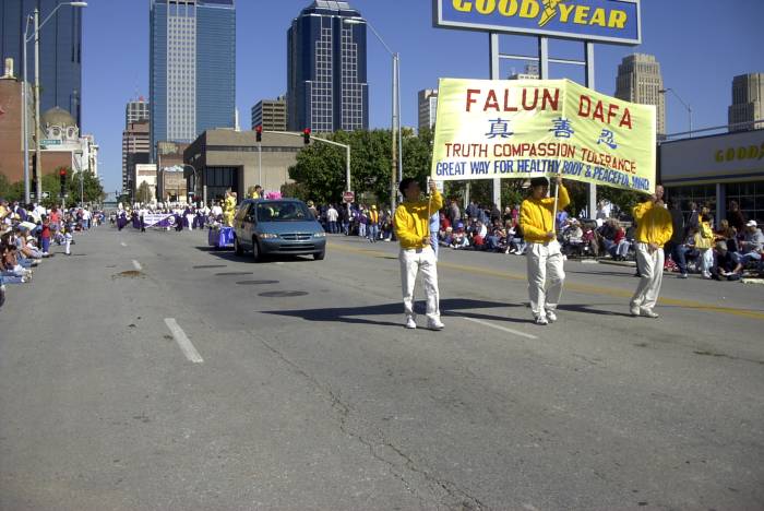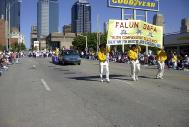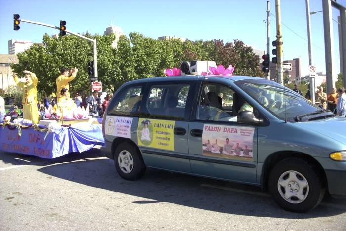 游行中,当三位学员高举着法轮大法的横幅,伴随着大法音乐出现在游行的队列中时,观众报以热烈的掌声。人们被花车上的弟子们的功法演示深深地吸引住了,赞不绝口并争相接过学员们散发的资料。学员向一位中国观众简短地介绍了大法在世界的洪传,以及江××的罪恶,她不住地点头,并愉快地接过了资料。很有意思的是,许多孩子们纷纷前来索要资料,学员叮嘱他们要好好地阅读资料上的内容,当学员接过一位大约3-4岁的小朋友时,孩子两手作莲花状索要资料。
