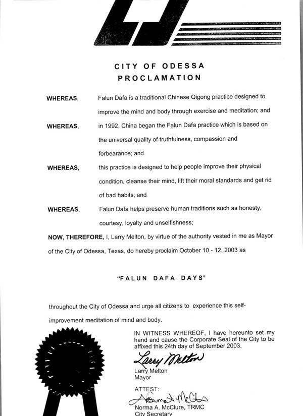 鉴此,我,拉里-梅尔顿(Larry Melton),行使德州奥德萨(Odessa)市市长职权,宣布2003年10月10日至12日为