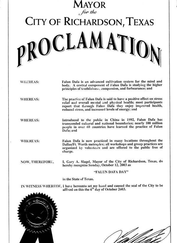 鉴此,我,加里-A-斯雷格尔(Gary A Slagel),德克萨斯州理查逊(Richardson)市市长,宣布2003年10月12日为