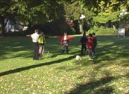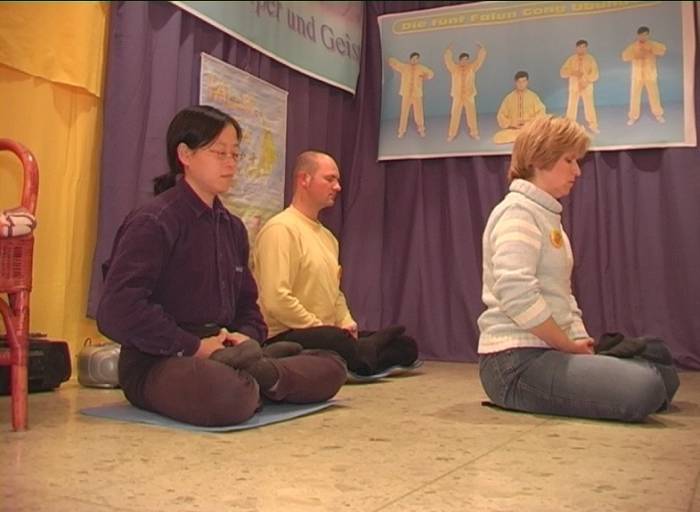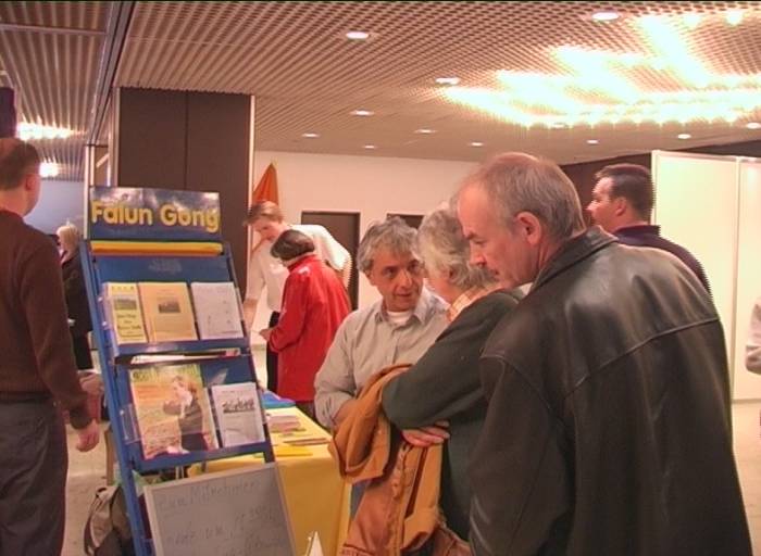 当地的法轮功学员得知消息后也报名租了一个展台,除了在展台边向参观者介绍法轮功及讲真相外,还在大厅外的草坪上进行义务教功。博览会的组织者也来到我们的展台向我们了解法轮功,并随后在展览大厅的大喇叭中对法轮功作了介绍,推荐有兴趣者参加法轮功义务教功。