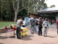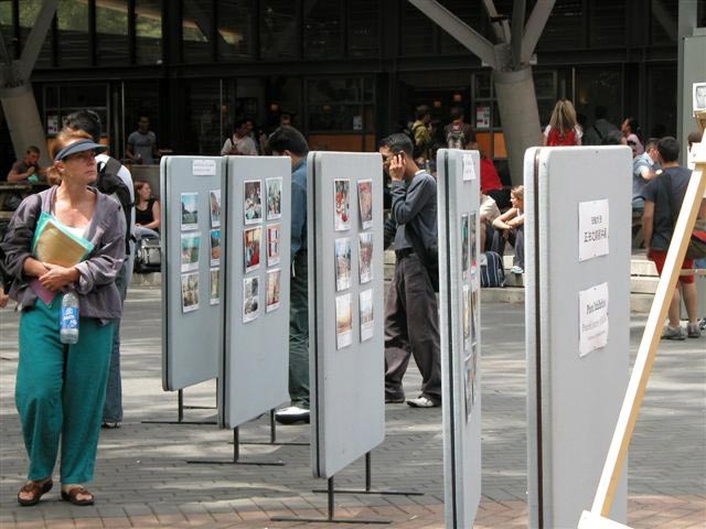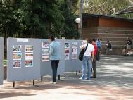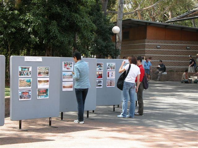 图片还在安放中,一位来自大陆的女学生走过来,看图片,接资料,谈起来。