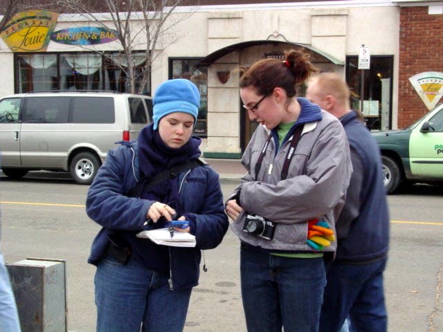 公演结束后,全体学员在公园进行了功法表演。这时公园里聚集了不少反战示威游行者,有学员马上意识到这是一次讲真相的大好时机,临时决定再加演一场。于是,大家冒着寒冷和小雨,也忘却了饥饿,精神饱满地投入到演出中,不少游行队伍中的人饶有兴趣地驻足观看。另外,在公园旁边的一家农贸市场里面,法轮功学员在室内也有幸租到了一个免费摊位,向路过的公众介绍法轮大法和散发真相资料。