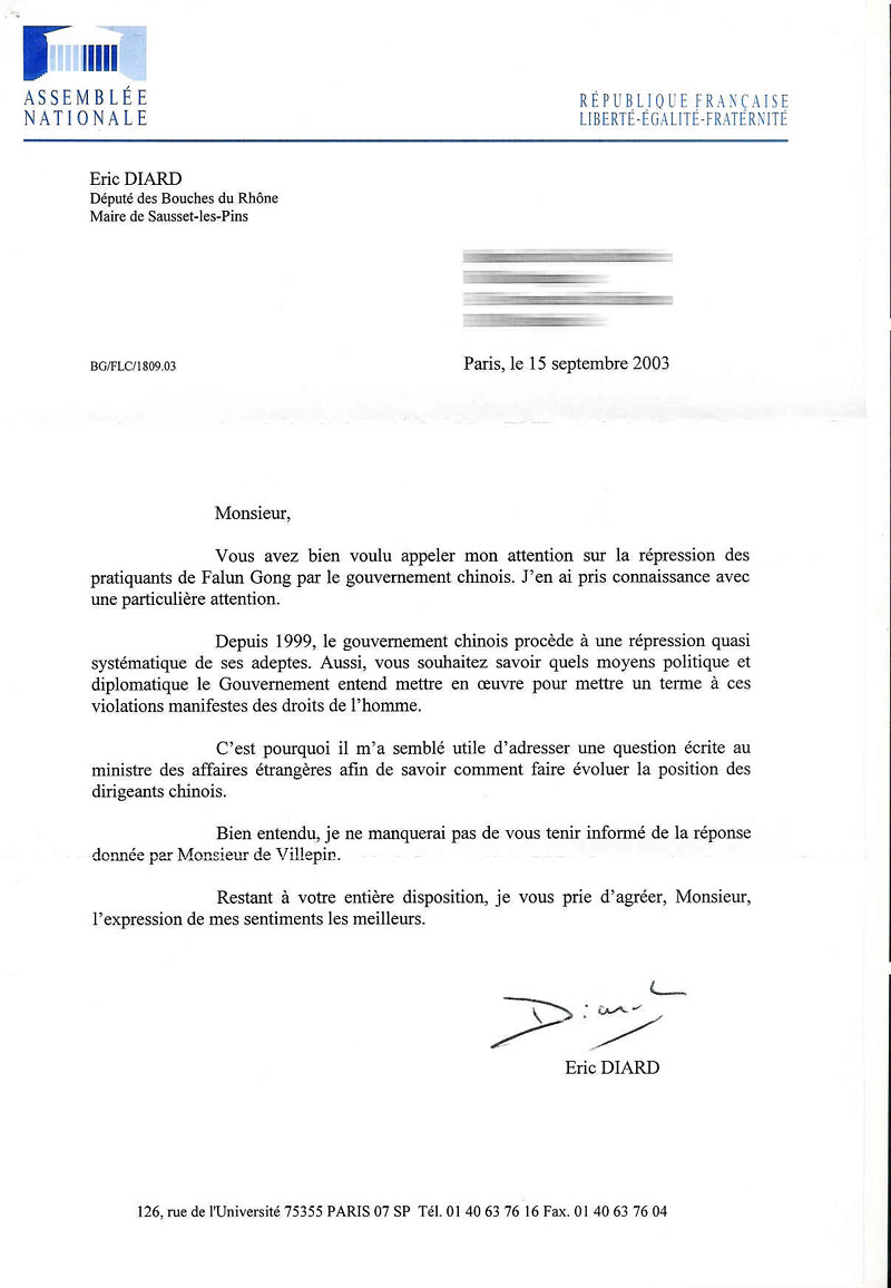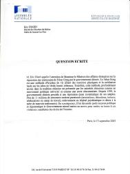 埃里克٠迪亚尔先生提请外交部长先生注意中国政府迫害法轮功修炼者一事。法轮功是一种以真、善、忍思想为基础的结合打坐和身体运动来净化生活的一种功法。然而这种深深扎根于中国的传统功法却被中国当局说成是具有颠覆性的政治运动和愚昧的X教。自1999年以来,中国政府就开始了近乎于系统地镇压其信众,将近7千1百万人[译注:原文如此。更接近实际情况的说法是七千万到一亿人]受到了迫害(逮捕、关押、酷刑、劳动教养、送精神病院,以及迫害致死)。因此,埃里克٠迪亚尔先生询问部长先生,法国政府将采取什么样的政治和外交手段来结束这种严重侵犯人权的状况。