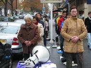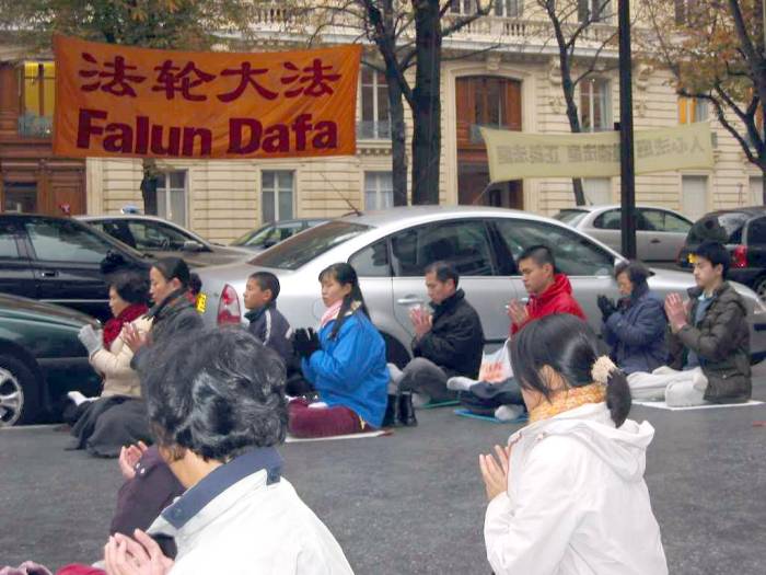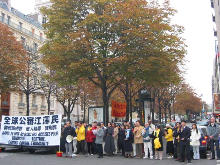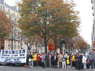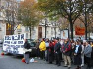 下午,学员们来到使馆前继续讲真象并发正念。以群体灭绝罪、反人类罪以及酷刑罪起诉江××的巨大标语牌立于街旁。傍晚时分,由于远处戒严,道路完全堵塞,一辆辆汽车排成长龙,缓缓经过标语牌,人们看清了真象。
