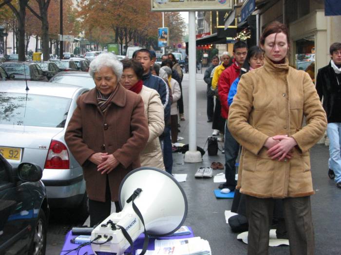 | 炼功 | 发正念 | 一位女士送来咖啡给大家驱寒 |