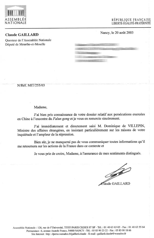 女士, 我仔细地看了您那份关于在中国实施的对法轮功的迫害的信,我衷心地感谢您。 我立即直接与外交部长多米尼科٠德维尔潘先生联系,并特别强调了您担忧的理由和这场镇压的规模。 当然,我会及时把所有他回给我的,有关法国在这一方面的行动的信息转达给您并