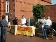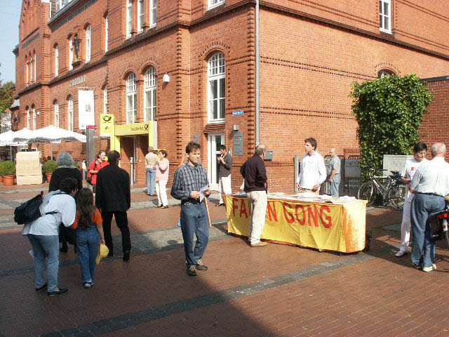 【明慧网2003年10月5日】9月20日,来自德国不同城市的学员们在东海岸的小城艾肯弗德(Eckernfoerde)举办信息日活动,向人们讲述发生在中国对法轮功的迫害,并展示五套和谐的功法。许多行人以前就听说过法轮功,有些人从未听过。对于这场邪恶的镇压他们除了感到震惊与不解外,还对受害的中国学员深表同情,并立即在征签表上签名支持停止迫害。他们认为应该把江××这样的独裁者告上法庭,他应为发动这场镇压承担责任。