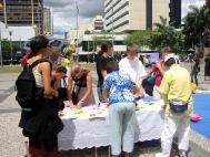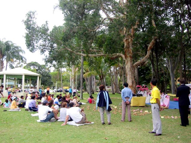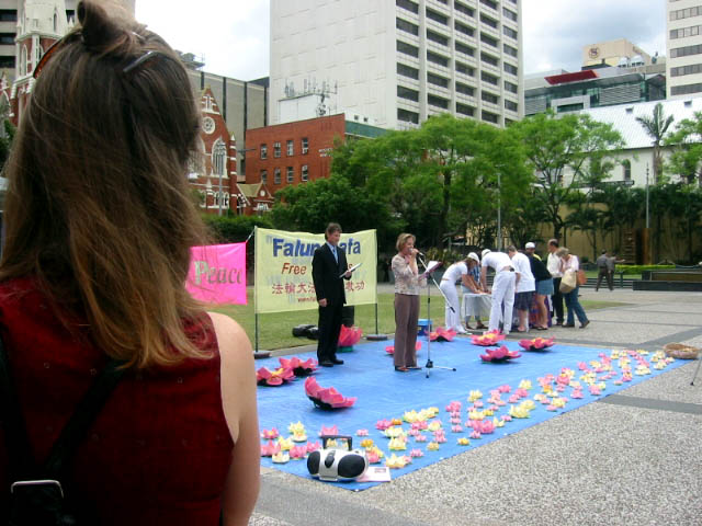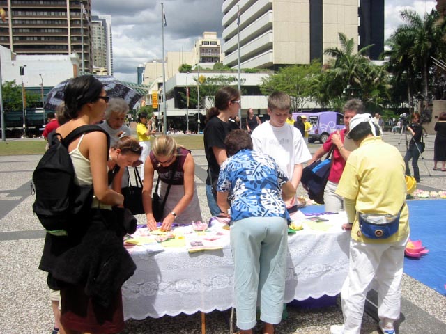 星期天,学员们在黄金海岸的凯斯卡蒂公园举行了类似的活动。这里是昆士兰第一个法轮功炼功点,也是人们星期天常来的地方。一些学员炼功,另一些学员布置场地。与日前布市的情况一样,这里也许多人参加了我们的活动,并学做纸莲花。文艺表演节目又增添了一个四重唱,歌曲的作者和演唱者都是来自昆省不同的地方的法轮功学员,他们在澳洲许多地方表演过。他们表演了两首歌曲,其中一首是“心灵的呼唤”。