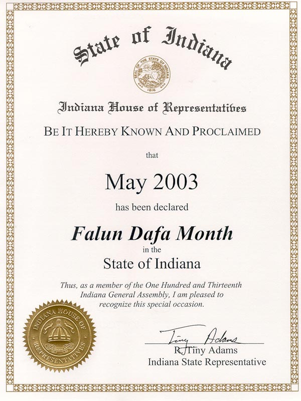 在此郑重宣布2003年5月为印第安纳州法轮大法月