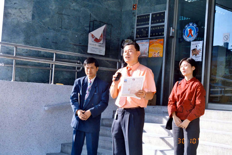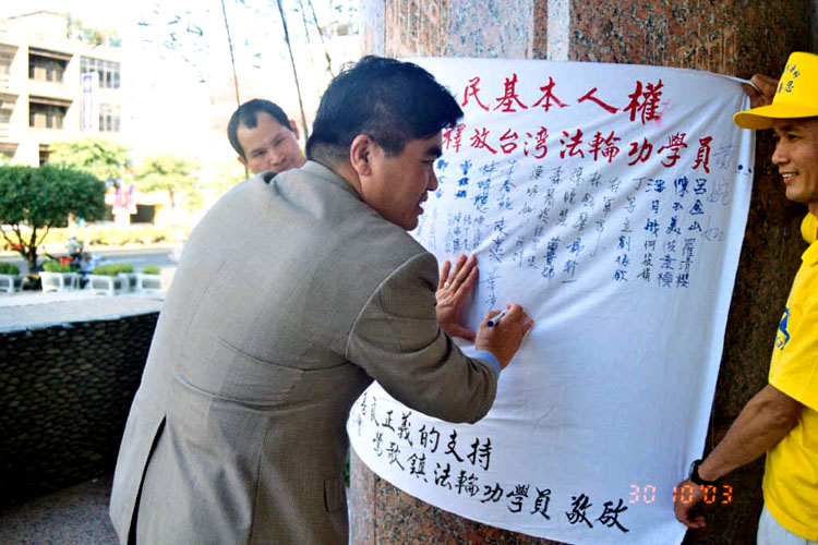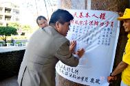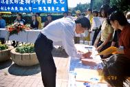 | 万美玲议员在记者会上谈话 | 立法委员郭荣宗秘书马志闵先生签名呼吁中共重视台湾人民基本人权 | 副县长黄敏恭先生致词祝福学员 |