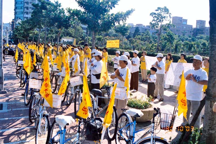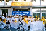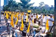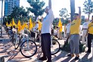 陪骑的学员穿着黄色印有大法字样的衣服,脚踏车上插着鲜明的小旗子,沿途吸引很多民众的目光。民众有的向队伍挥手,有的前来了解真相,对于信仰真善忍的好人却无端遭受迫害给予了充分的同情与支持,更对于学员为营救同修而单车环岛的壮举感到敬佩。