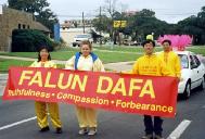 【明慧网2003年11月10日】11月8日,德州大法学员参加了在圣玛可斯的海斯郡退伍军人节游行。游行队伍中,法轮功学员的彩车亮丽柔美,格外引人注目,写有法轮大法字样的大红横幅很远就吸引了人们,观众们纷纷从学员们手中接过真相材料。游行组织者特意赶来和大法学员握手,赞叹我们的花车非常美丽,同时感谢我们的到来。