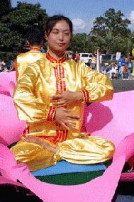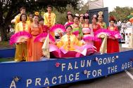 花车准备来自中国的安妮-李,和正在此短暂访问的来自Tampa的劳拉-海登,是这次参加佛罗里达大学返校节的法轮功花车中的30名学员中的两位。她们身着中国传统服装。