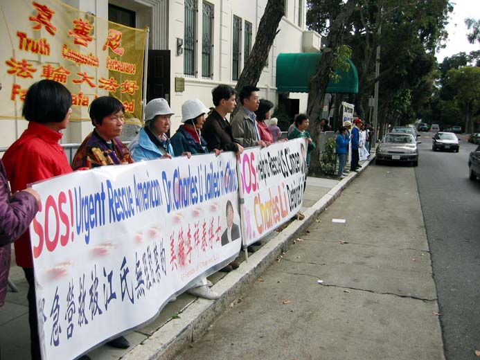 【明慧网2003年11月14日】11月13日中午,旧金山湾区的法轮功学员在中国驻旧金山领事馆前召开新闻发布会,揭露中国政府加重对法轮功学员、美国公民李祥春的迫害。学员们获悉,中国当局每天强迫李祥春参加洗脑班3个小时,并逼他承认犯罪。对此,学员们强烈要求中国当局立即无条件释放李祥春,停止对所有法轮功学员的迫害。