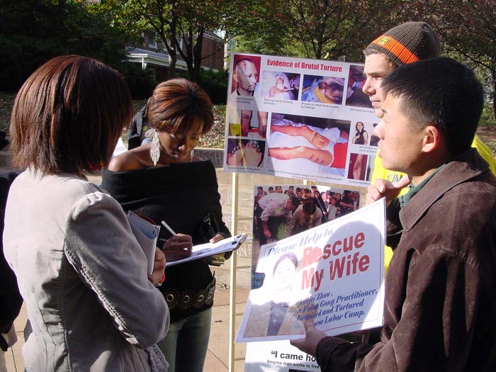 SPELMAN大学是一所以黑人为主的大学,他们尤其记得曾经生活在亚特兰大的民权领袖马丁-路德-金博士以及他的和平非暴力运动。当他们看到遵循“真善忍”、“打不还手、骂不还口”的法轮功学员,在争取自己的最基本人权——信仰自由的过程中,所表现的坚韧不拔,不禁油然而生敬意。他们在给中国国家主席胡锦涛的征签表上,纷纷签下自己的名字。