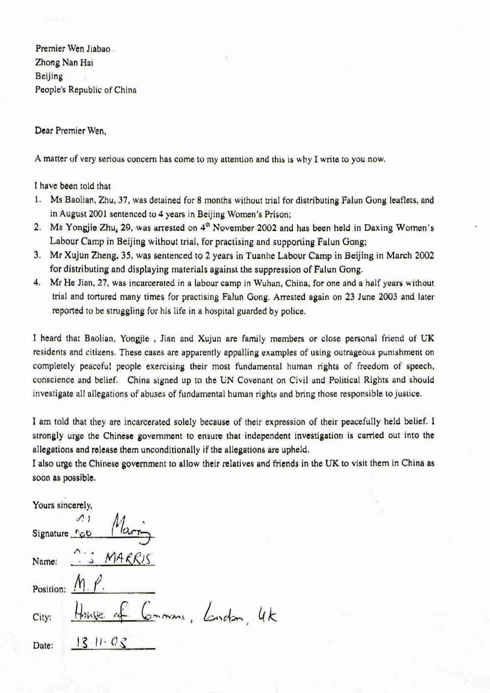 据我所知,以上四人都是英国居民的亲属或密友。这些案例显然都是对和平公民的蛮横惩罚,而这些公民仅是在履行他们言论、信仰自由的基本人权。中国已经签署了联合国公民和政治权利条约,必须对这些践踏基本人权的案例进行调查,并将责任者绳之以法。