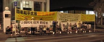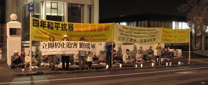 【明慧网2003年11月2日】10月30日和31日晚,新西兰大法弟子在中领馆前举行烛光守夜,发正念,声援吉林监狱被非法关押正在绝食的大陆同修,要求中国江氏政府立即无条件释放刘成军等大法弟子,呼吁正义人士帮助制止这场对修炼“真善忍”的好人的残酷