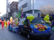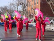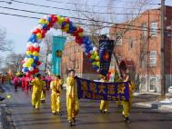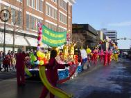 在本次游行中,由来自Calgary,Edmonton,Regina,Saskatoon和Toronto等地的30多名法轮功学员组成的队伍表现突出,称为最受欢迎的一个团队。在身着醒目的法轮大法金黄色炼功服的学员带领下,举着“法轮大法好”的横幅和色彩缤纷的气球彩虹走在了队伍的最前面。紧跟其后的是身穿红色鲜艳服装的扇子舞队,女学员们的优美舞姿引来了观众们的阵阵掌声和啧啧称赞, “太漂亮了”,“中国女孩!”之后,是挂着“世界需要真善忍”大型横幅的花车,花车上由六名中西大法弟子组成的功法表演队,在悠扬的音乐声中向人们展示了优美舒缓的法轮功。而在队伍的最后,是由西人法轮功学员组成的自由舞表演。一路上,只要是法轮大法队伍经过的地方,就会不时的从人群中传出“最棒的!”,“哇,法轮大法!”的喊声,有些热情的观众甚至还跑进游行队伍,与大法学员击掌和握手,表示祝贺和称赞。
