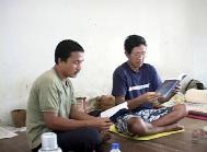 | 每周四下午法轮功学员到帮利监狱教功 | 犯人在牢房里读印尼文的《转法轮》 | 乡邻看Wayanloji变好了,也来学法轮功。 |