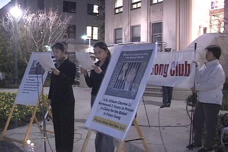 在烛光下,演讲持续了大约一小时有余。活动结束前,主持人王靳威说,“今晚的烛光守夜即将结束,但是我们的营救李祥春和刘成军的活动不会停止,直到他们被无条件释放;我们营救在中国受迫害的所有法轮功学员的活动不会停止,直到在中国的所有法轮功学员被无条件释放。我们相信,没有任何迫害能真正的把法轮大法打压下去,因为真善忍永存人们心中,因为真善忍是宇宙的真理!”