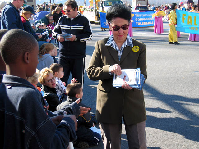 【明慧网2003年11月25日】在圣诞节来临的前一个月,是美国的节日季节。宾州州府海里斯堡每年都要在此期间举办节日庆祝游行。11月22日上午10点,在海里斯堡举办了宾州中部最大规模的节日游行。今年游行的主题是“美国--悠久的历史和节日传统”。法轮功学员应邀参加游行表演。