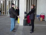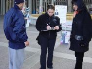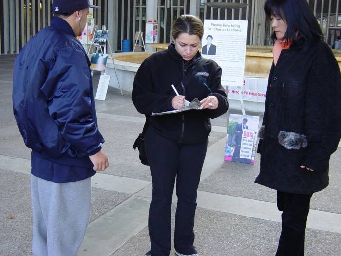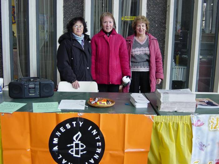 虽然这次图片展在室外举行,天气很冷但学员们都很热心在做,有两组学员远道开车赶来支持这次活动。看到了这些明白了真象的人们,学员们的心里都充满了温暖。