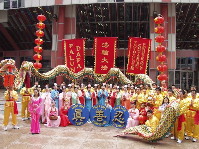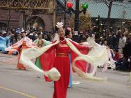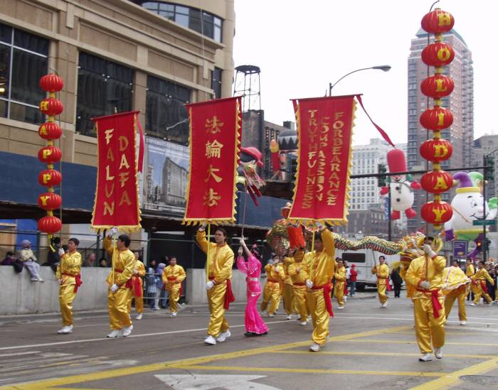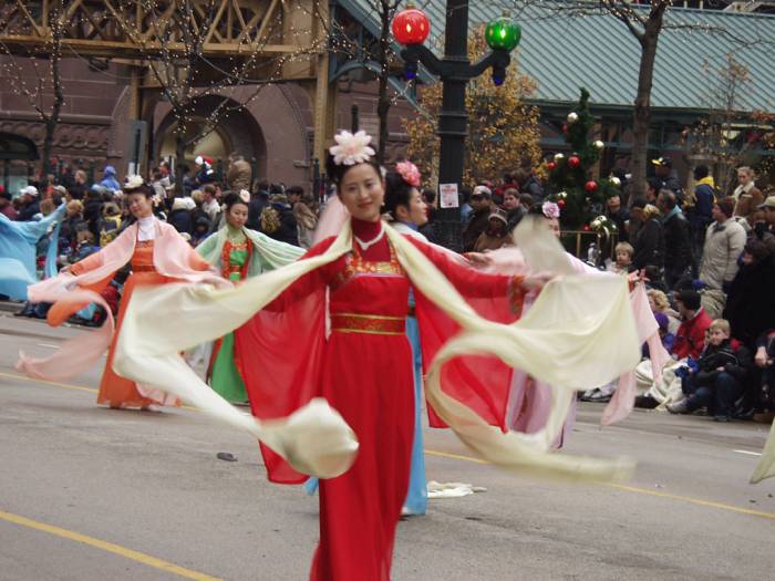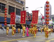我们不但成为第一支跻身这一盛大游行的华人代表队,而且组委会对我们的申请倍加青睐,邀请我们组成两支风格炯异的表演队――舞狮舞龙队和仙女舞队。新制作的大红灯笼向芝加哥人民致以节日的问候,三面由科罗拉多大法弟子特意赶制的大法旗帜气派非凡。纽约弟子为我们赶制的崭新炼功服使我们的队伍神采奕奕。彩狮舞动,金龙翻卷,锣鼓喧天。大法弟子意气风发,舞出了大法的气势,舞出了神威,强烈地震撼了世人。