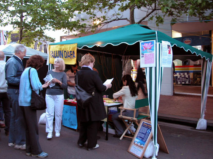 在从下午4点到午夜12点的整个活动中,我们展位前面的人们一直络绎不绝。一些当地居民当时就表示要学法轮功。有来自中国的学生,看到我们在这里先是很惊讶,但送给他们资料已经不拒绝了。一个学员将“与你同行”的中文小册子递给一个中国女学生时候,她身后的一个男学生马上抢先拿了过去,因为他手里的传单是英文的,可以看出他迫不及待的心情。