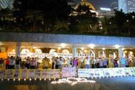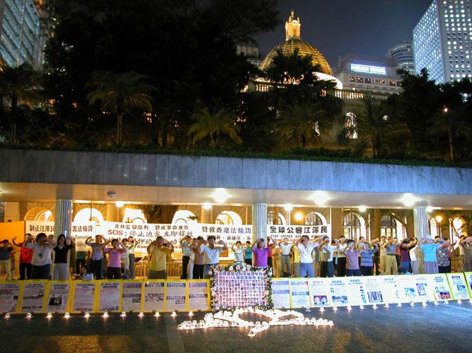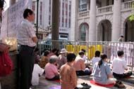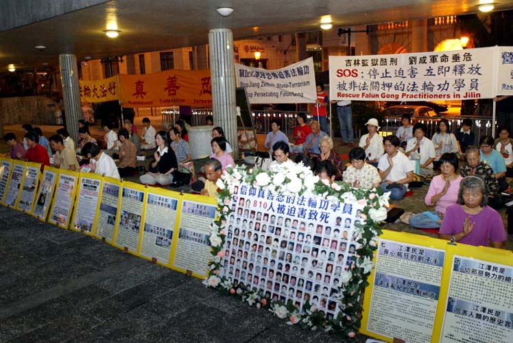 入夜后,静坐的学员点燃烛光,悼念在大陆死难的同修。现场的功法示范及真相展版,不时吸引着路人观看。
