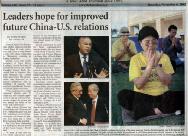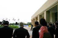 6日晚,图书馆外边举行一场小小的欢迎会,前总统老布希和一些美国官员以及中国官员共同观看节目,法轮功学员在不远处向他们举着横幅请愿。宴会后,中国官员陆陆续续走出,学员齐声向他们道出自己的心声:“法轮大法好!”其中一个学员真诚地对中国官员说:“不要相信江××说的,说的是假的。”一中国官员回答:“我没有相信。”