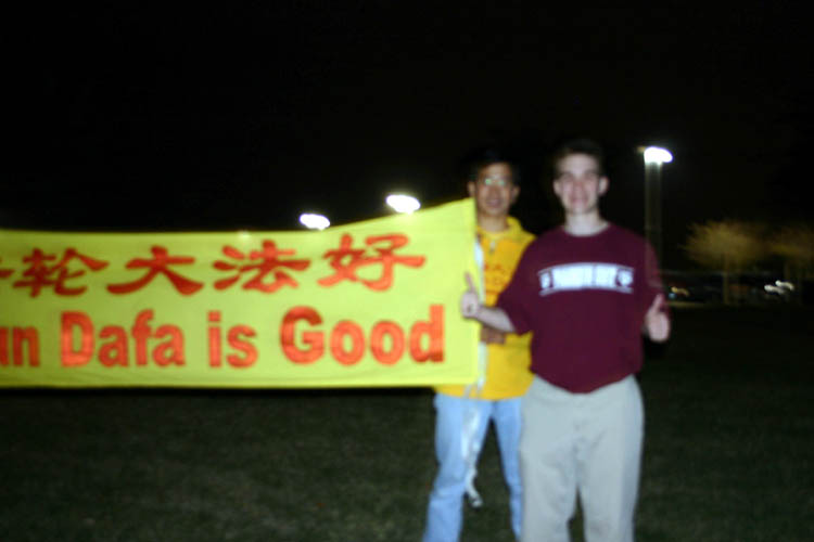 值得一提的是,德州农工大学的一位美国大学生,在去年十月江泽民来访问德州时知道了法轮功的真相后,主动加入了法轮功学员讲真相、呼吁制止迫害的正义行动。他散发很多有关法轮功的资料,希望更多的美国人像他一样对法轮功有所了解。