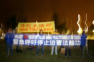 这次中国高层官员访问美国德州与美国官员共同举行中美关系研讨会,这位年轻人特地赶来与当地的法轮功学员一道,在图书馆入口处和平请愿,这是中共高层官员每天的必经之路。尽管天气寒冷,他仅穿着短袖校服,但热情很高,他还制作了两个横幅,展示给中国官员,并且质问中国官员:“你们为什么要镇压法轮功?”他告诉人们: “法轮大法好!我支持法轮功!”就这样,他与法轮功学员一道举着横幅坚持在寒冷的夜晚中。(见上图)