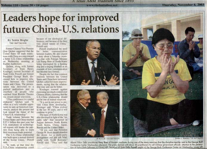 6日的农工大学的日报“THE BATTALION”的首版,刊登了大幅有关法轮功学员炼功的照片,引起了师生们的注意。这是日发行量一万份的日报。