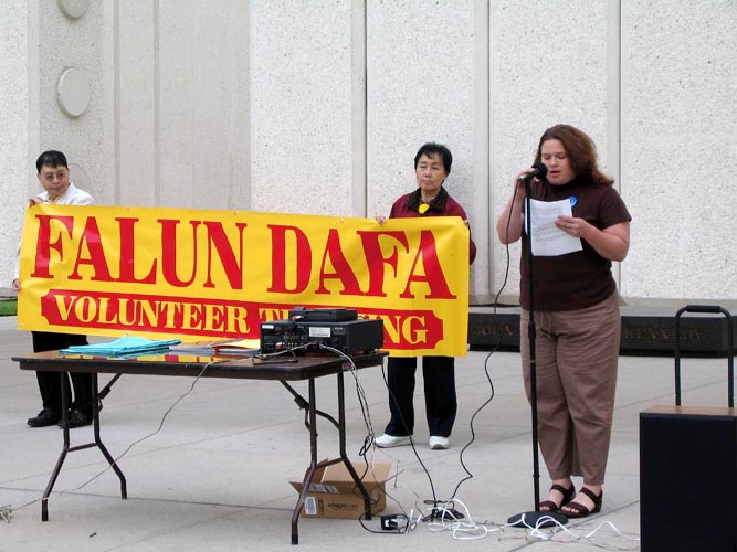一位学员在新闻发布会的发言中说:“在中国发生的这场对法轮功的镇压不仅违反了中国自己的宪法,同时也违背国际法……江氏因其对法轮功的迫害以在许多国家遭到了起诉。”