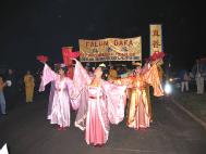 法轮功队伍是几十个花灯队伍中唯一的具有东方特色的游行队伍。优美的莲花舞伴着吸引了许多路边的观众。“真、善、忍”和“节日快乐”的彩旗表达了学员对当地群众的节日问候。一个彩灯点缀的花车和车上向观众展示功法的学员也是这只队伍的焦点。