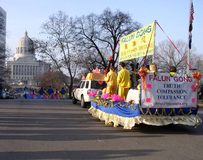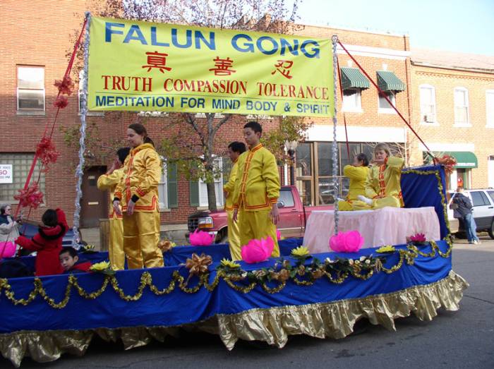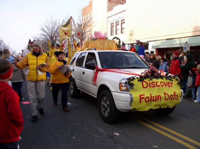 如同花车头部金黄横幅上写的,更多的杰佛逊的民众“DISCOVER FALUN DAFA”(发现了法轮大法),这是节日的真正收获。