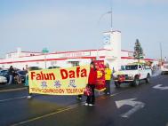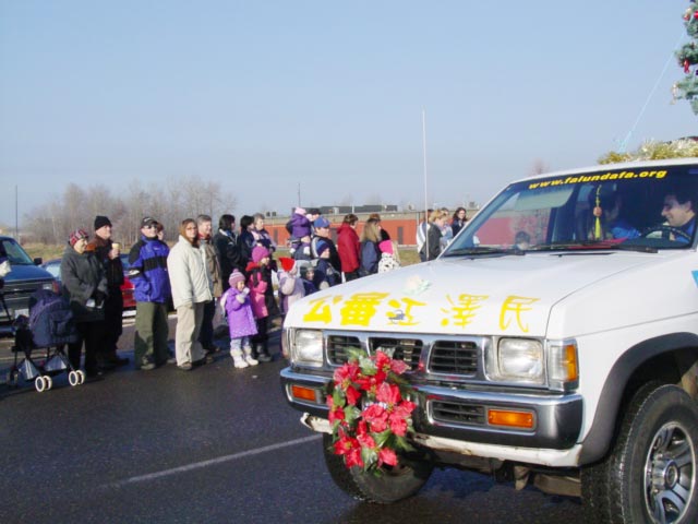有一个活动是在计划之外的,就是参加圣诞游行。当地的一名学员正为他所在的公司装饰游行用的花车,他想到法轮功学员也应该参加游行让人们了解法轮大法。这时距离游行开始只剩下两天的时间了。于是我们很快的办好了参加游行的申请手续。第二天我们就着手装饰游行用的汽车。虽然我们资源有限,准备游行的时间也很仓促,但我们七名同修齐心协力成功的参加了游行。