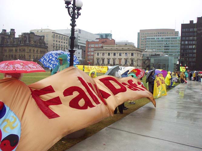 而国会山西侧的法轮功学员始终排着整齐的队伍,在雨中,伴着祥和的音乐坚持炼功、打横幅。一位加拿大皇家骑警对法轮功学员说,他有一段时间不在现场,但是,他十分了解法轮功学员的平和,所以对法轮功学员非常放心。