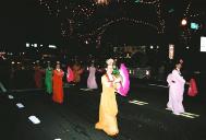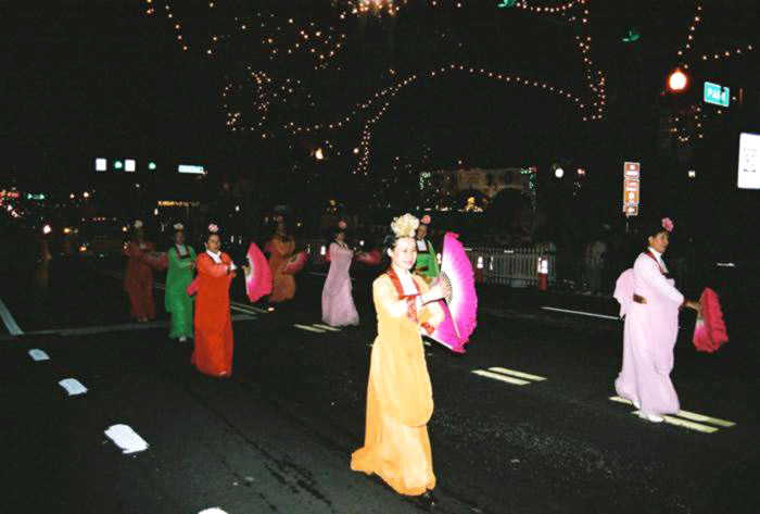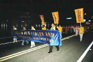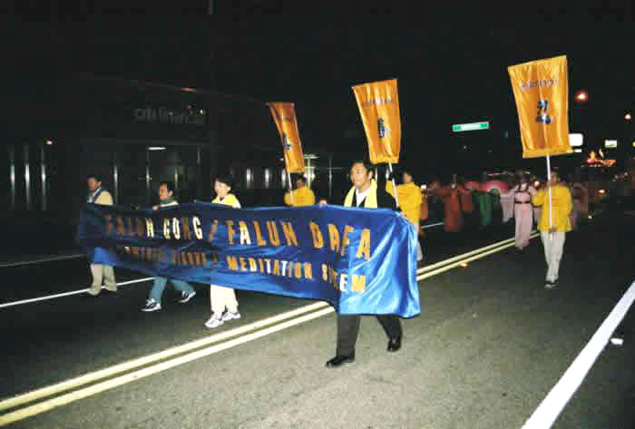 花车上摆放着两朵粉红色大莲花,六名学员在花车上做功法演示。走在花车前面的是写有“法轮大法─身心修炼系统”的横幅。优美的炼功音乐和真善忍横幅得到观众们的热烈欢迎。当队伍通过主席台时,主持人介绍了法轮功,并称赞道:“他们真漂亮。”许多观众欢呼:“来自中国的法轮功。”一名女学生用中文说:“法轮功,我爱你。”还有一个小伙子用中文高声喊道:“法轮大法好!”他们的热情温暖着在寒冷夜晚中参加游行的学员们。