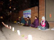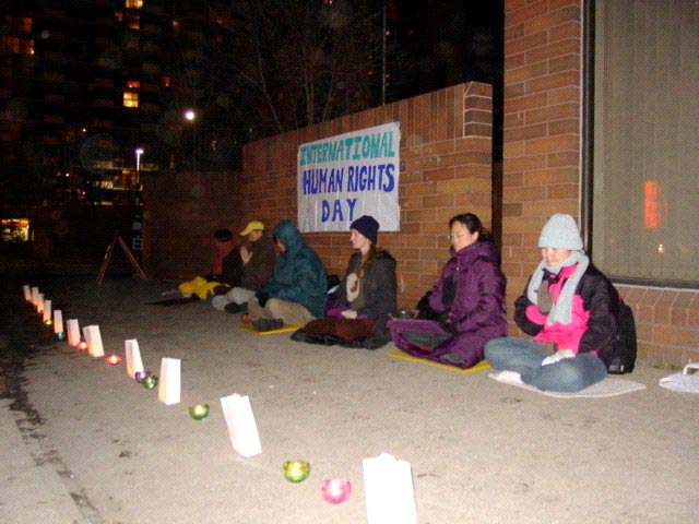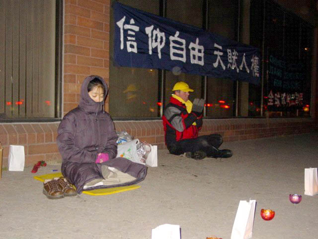 傍晚5时,法轮功学员陆续从工作单位匆匆赶到了中领馆,挂起了“世界人权日”、“信仰自由天赋人权”、“法轮大法真善忍”、“结束迫害还法轮大法清白”和“全球公审江泽民”等横幅,并点起了蜡烛。卡尔加里的冬天非常寒冷,当时气温达到了零下十几度,寒风飕飕,法轮功学员冒着严寒在烛光前盘腿打坐,开始烛光守夜,借12月10日世界人权日,再次向全世界发出呼吁,要求中国江氏集团立即停止这场建立在谎言基础之上的、对法轮功和法轮功学员的史无前例的迫害。