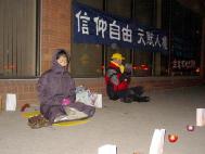 | 法轮功学员在中领馆前烛光守夜 | 严寒中,法轮功学员的和平抗议 | 法轮功学员向警察讲真相 |